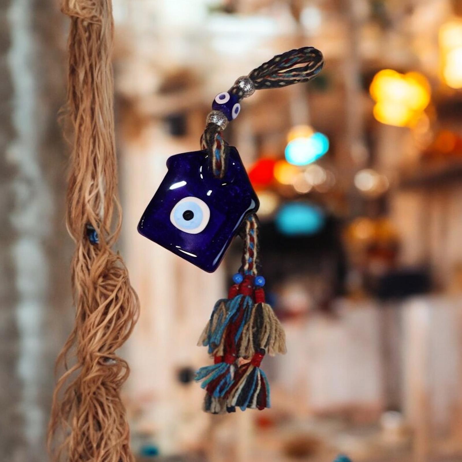 Handmade Glass Evil Eye Wall Hanging – The Turkish Touch Protect your home with style.; Crafted using traditional Turkish glassmaking, this evil eye ornament is both a decorative piece and a symbol of protection.; Featuring colorful tassels and artisanal details, it adds a cultural charm to any wall.; 🟣 100% handmade 🔵 Original glass evil eye bead 🎁 Perfect as a meaningful gift 🧵 Finished with hand-braided tassels Dimensions: Glass evil eye diameter is approximately 10 cm.; Note: Since each piece is handmade, slight variations in color and pattern may occur