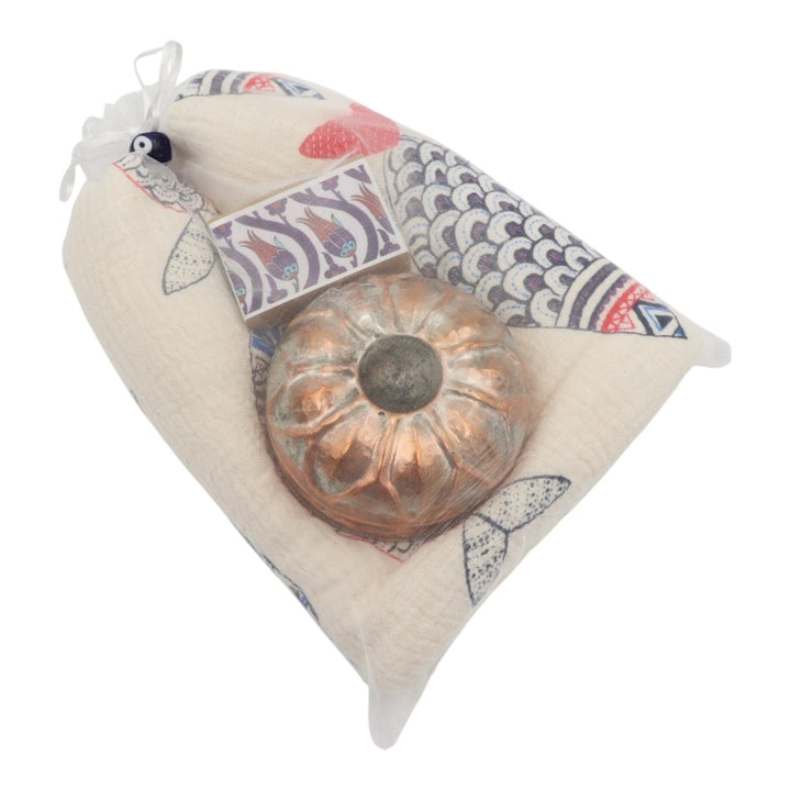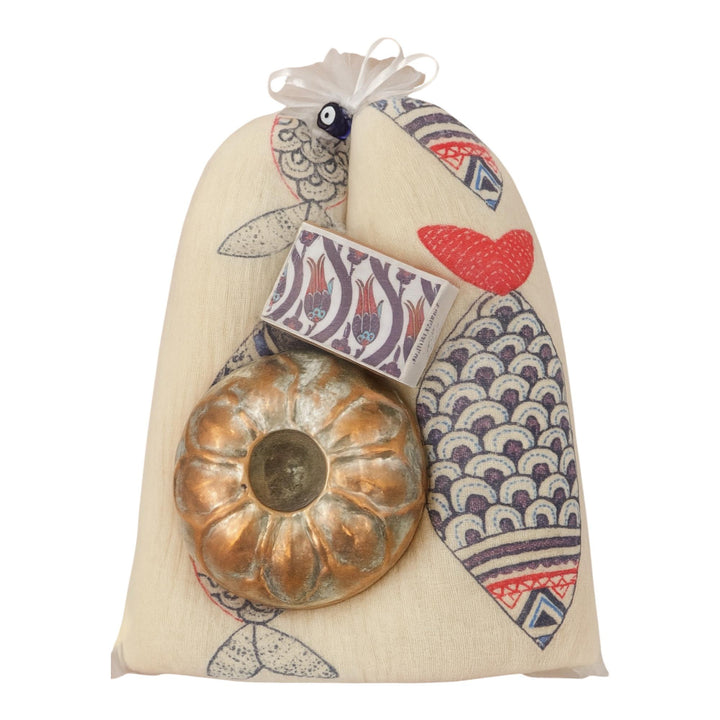 Beautifully wrapped in a gift pouch featuring an evil eye bead, this elegant Turkish set includes: